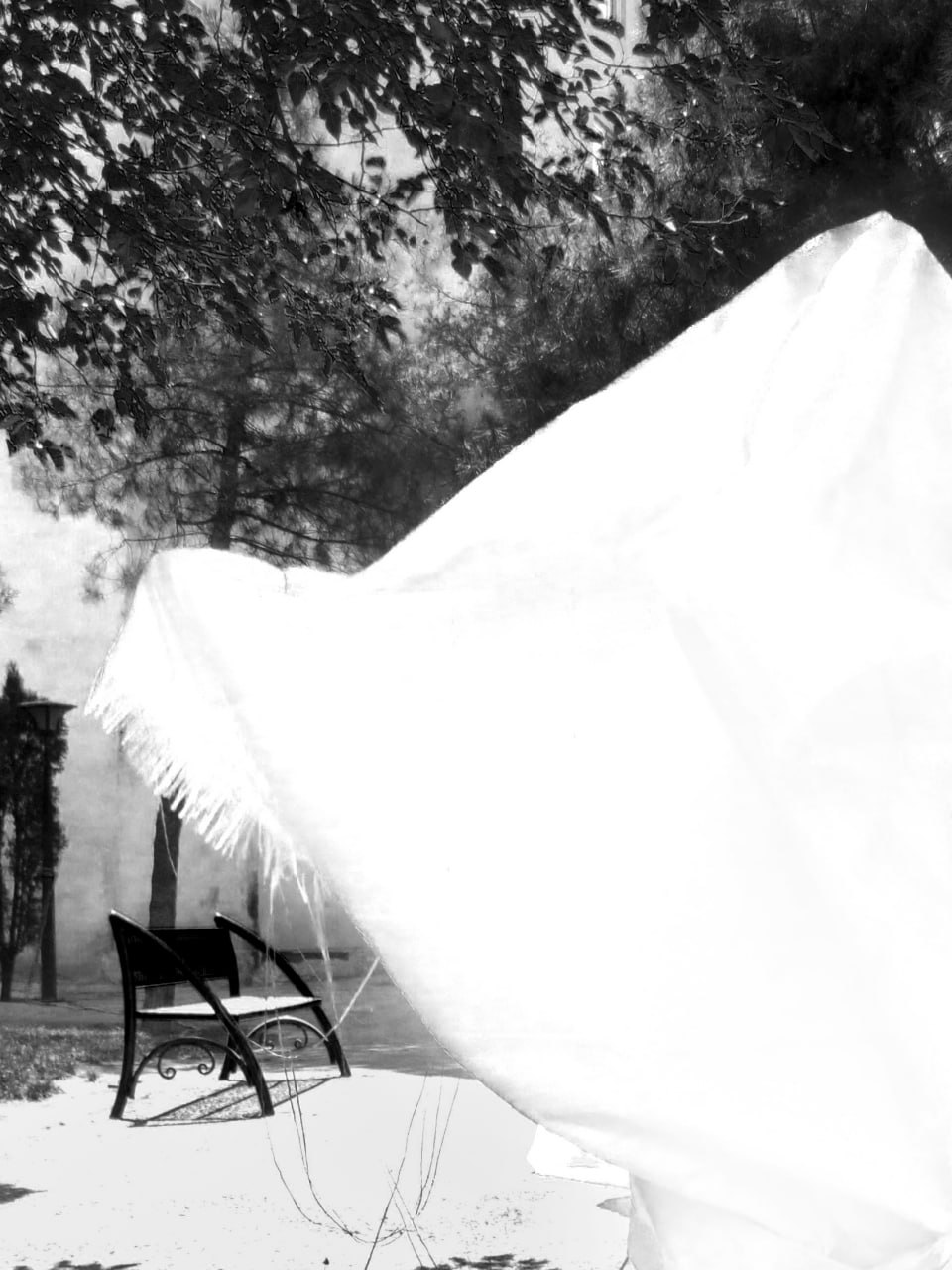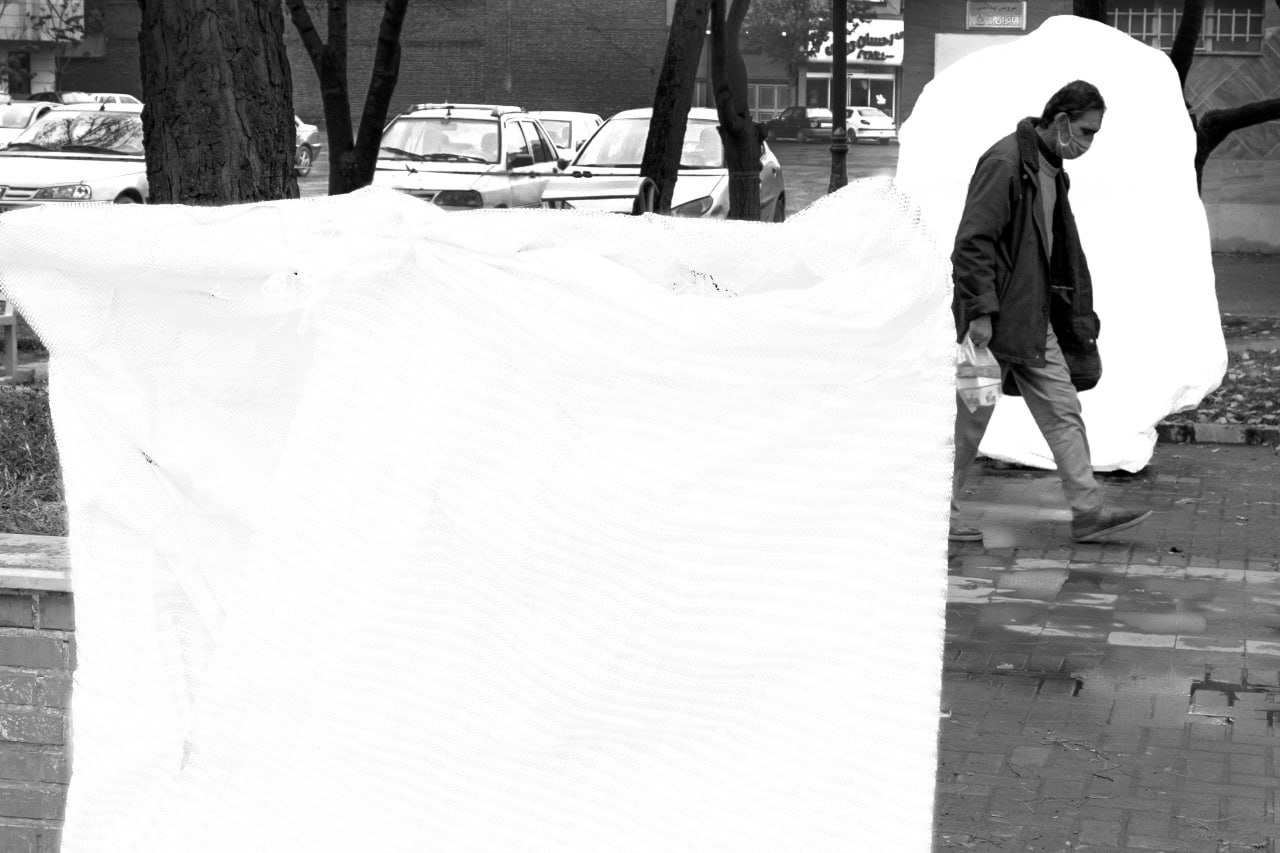 آنچه در نگاه آغازین، در این مجموعه، خود را با قدرت به چشم مخاطب تحمیل می کند، سفیدیِ اغراق آمیزی ست که در سطح وسیعی از کادر، از تعمدِ عکاس، حکایت می کند... داستان از همین جا شروع شده است! گویی داستان، واقعیتی ست نه در مقام آنچه دیده میشود، بلکه در هیئت آنچه از دیدن بازمیماند! عکاس در برابر پدیدهای به ظاهر عینی ــ پاندمی کرونا ــ ایستاده، اما ترجیح داده است بهجای بازگویی، درونِ خلأیی از حذف و سفیدی، واقعیتِ روایی خود را جستوجو کند. آنچه بر سطح عکسها نشسته، سفیدیِ تند و بیامانِ گونیهای پوشانندهی وسایل شهری نیست، بلکه انگاره هایی مالیخولیایی که از مفاهیمی مرگ آجین، آغاز میشود و آرامآرام تا نگاره هایی پاریدولیایی امتداد مییابد. هر لکهی سفید، هم نشانهی فقدان است و هم حضورِ سنگین چیزی که نمیخواهد دیده شود.