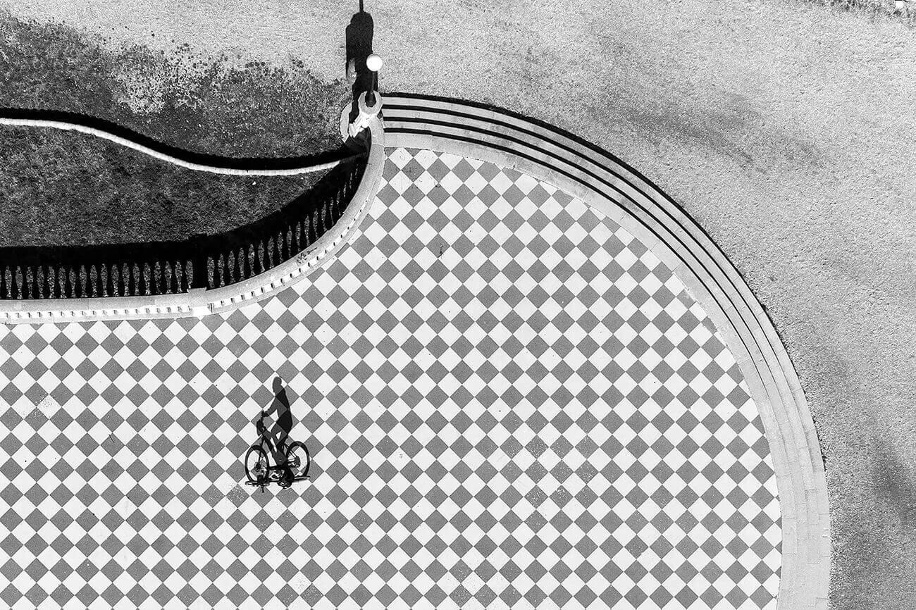 عکس «سایه دوچرخه» که با پهپاد از سایه دوچرخهسوار و خطوط شهری گرفته شده.
